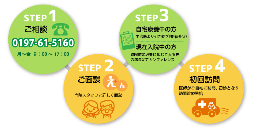 ※ 患者様の病状によっては、早急に対応が必要な方もいらっしゃるので、必ずしもこの通りの手順を踏まない場合もございます。ご了承下さい。
